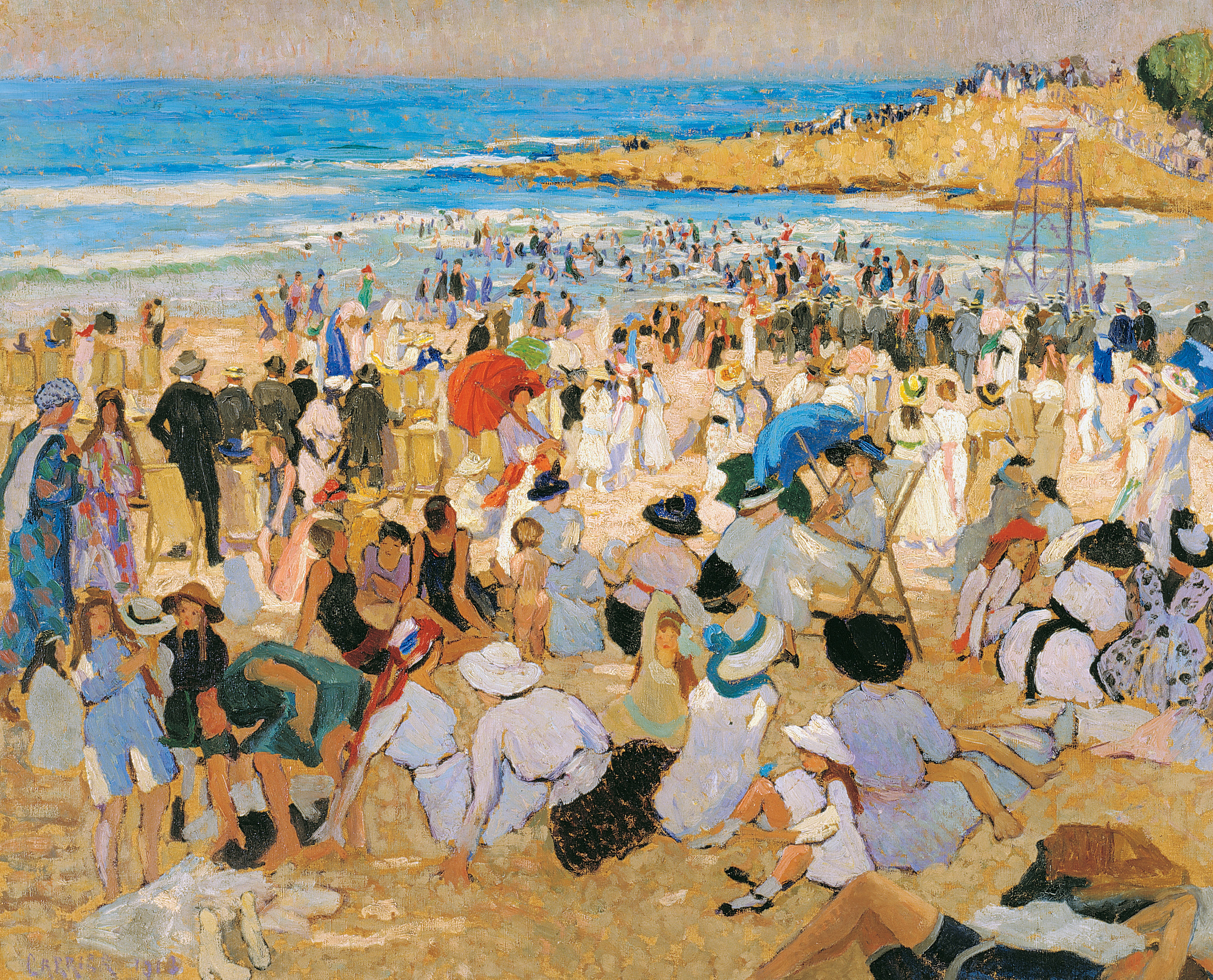 In the early 1900s, the issue of public decency was of top concern and by-laws against mixed bathing were in place to ‘protect’ the morality of Australian society. In Carrick Fox’s painting, crowds of people gather on the sand, complete with umbrellas, deckchairs and modest clothing. Interpreted as a reflection on male and female roles at the time, most women clothed from head to toe, sit passively on the sand with their children while the men are free to surf. This reflects Carrick Fox herself, a talented artist who spent the majority of her career in the shadow of her artist husband, Emmanuel Phillips Fox. In recent years, Carrick Fox has been recognised for her important contribution to the story of Australian art.
