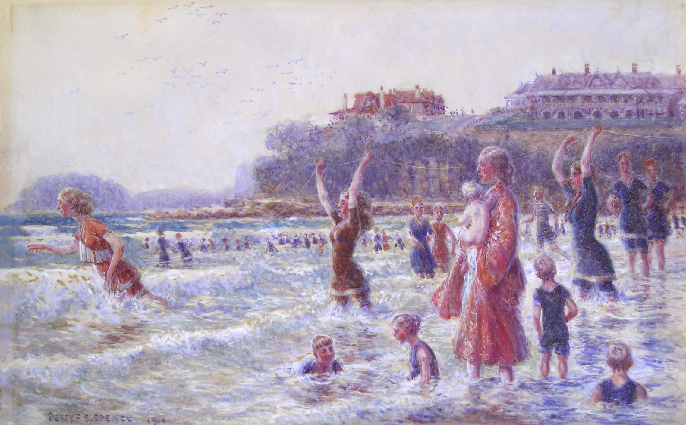 4. Percy Spence (1868-1933), Manly Beach with Lady Lifesavers, 1910, watercolour on paper, 18 x 27cm. Purchased 1975. (A0402)