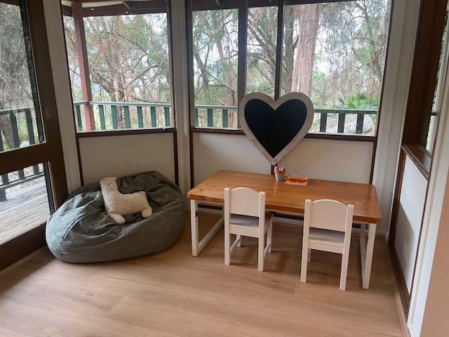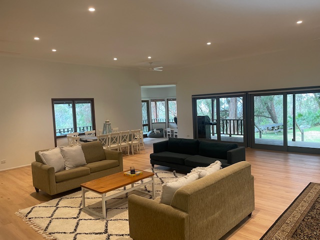 A large communal living space opens onto a wraparound verandah, overlooking a private grassy outdoor area with barbecue.